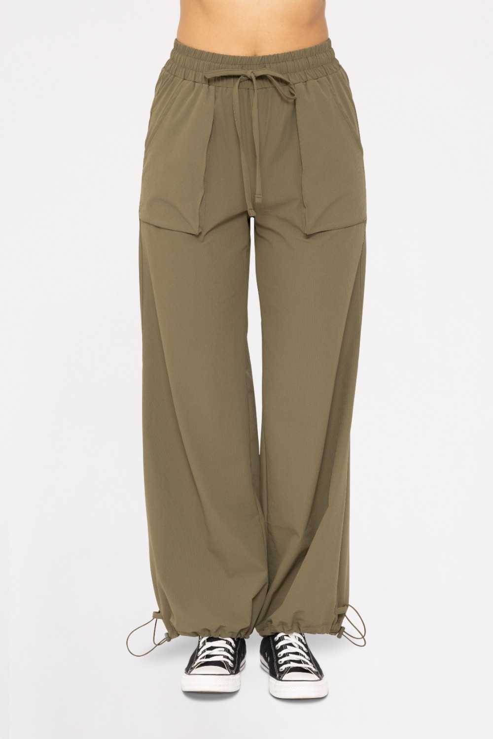 Ribstop wide pants with bungee bottom openings for a wide leg or jogger look, cargo patch pockets, elastic waistband with adjustable self ties, and single welt back pockets.