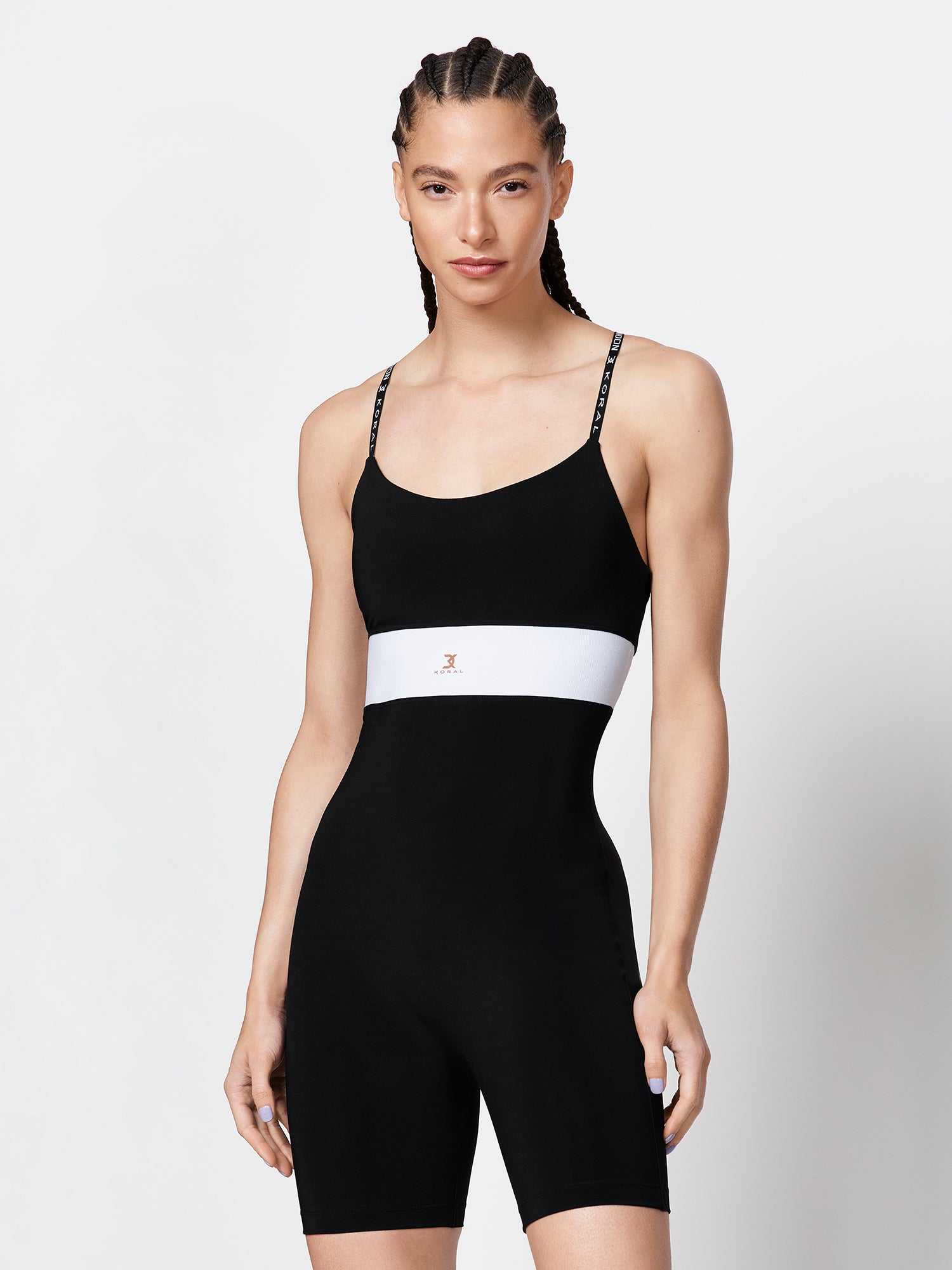 Koral Blackout™ fabric is cut from biodegradable yarn that provides high compression and moisture wicking, and it takes shape in the form-fitting Reeva Blackout Jumpsuit. The logo detail on the contrasting waistband highlights an hourglass figure, and the bicycle short hemline adds extra drama. Fits true to size, take your usual Koral sizing Recommended for High Performance