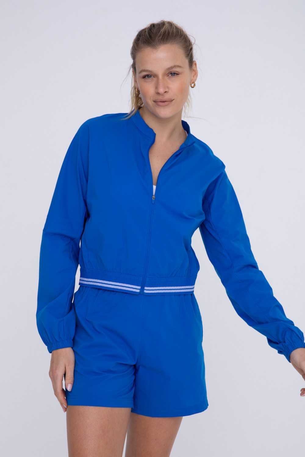 So sporty, this bomber-inspired jacket is made using a lightweight ripstop stretch woven fabric for extra durability. It features a full zip front, a boxy fit, a novelty striped elastic rib at the waist, elastic sleeve cuffs, a kangaroo pocket, an interior pocket, a mock neck collar, and sleeve and side panel seaming for additional mobility.