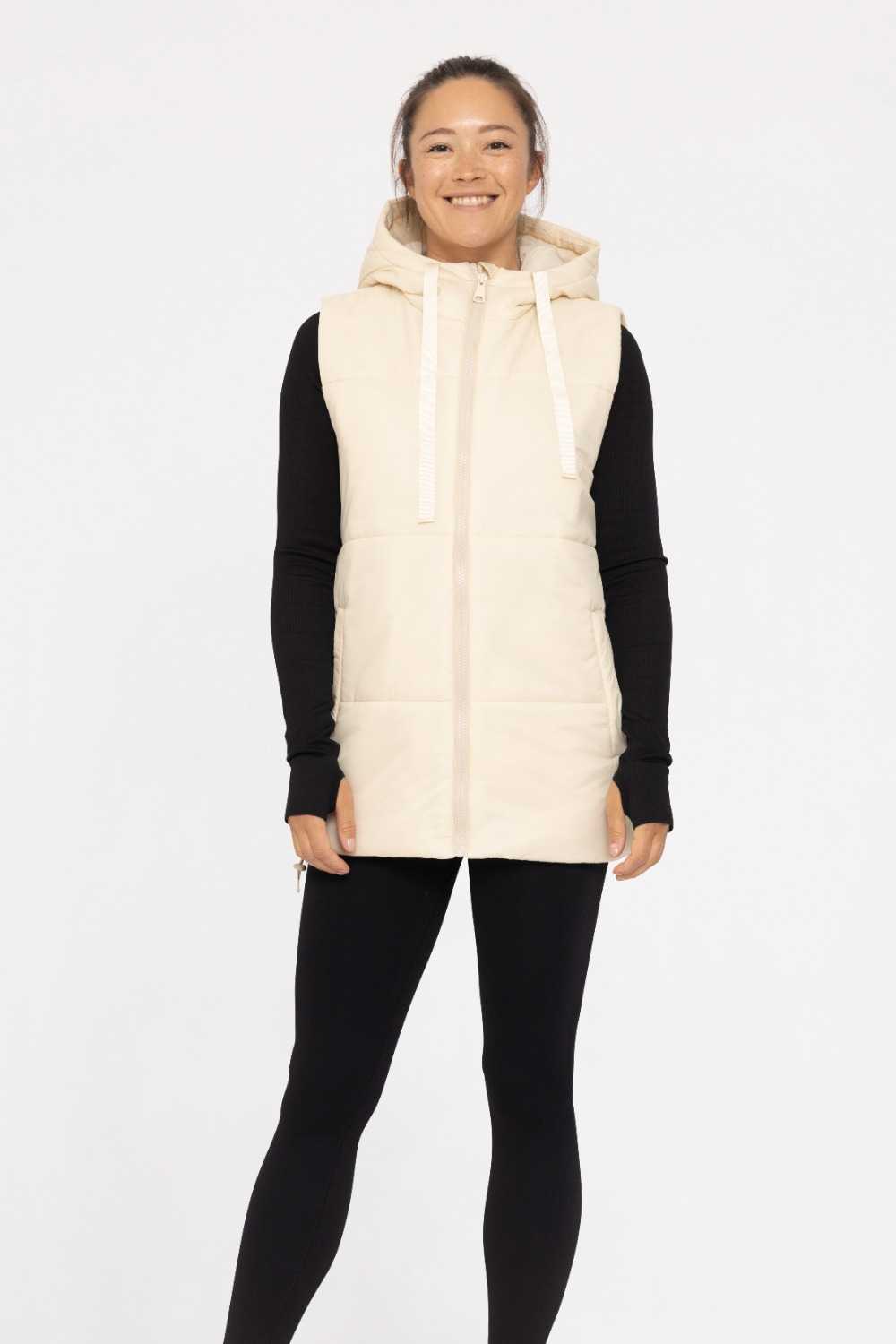With a longline silhouette, our poly fill padded vest is an ideal throw on piece for when the temperatures start to drop. It features a full front zip with zipper facing, a three panel hood, a high neck, an adjustable drawcord at the hood, hand pockets, and an adjustable bungee at the hem to keep warmth in.
