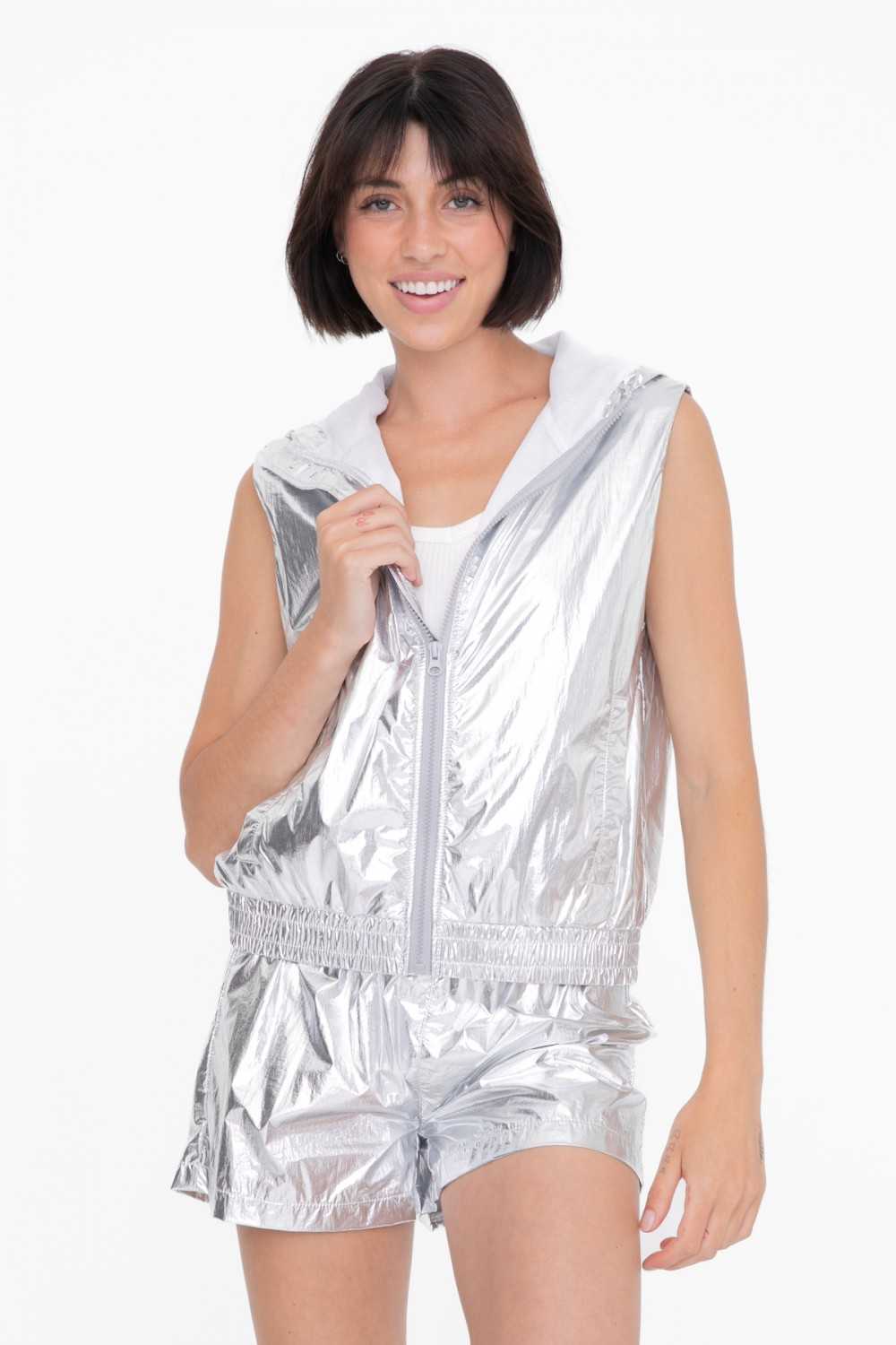 Top off ay look with this retro 80s metallic vest. Perfect for holidays and special occasions, this vest is fully lined with a breathable mesh, has hand pockets, and a hood. Style it with streetwear for an added edge!