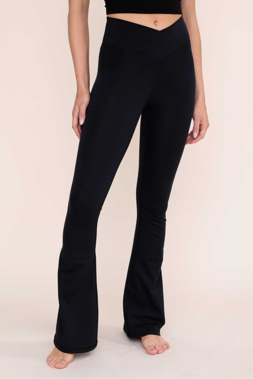 These high waisted leggings have a flattering crossover waist design. Made in our very soft, poly/spandex blend, Venice fabric for added comfort. The flared leg cut allows for better mobility. Perfect for your weekly yoga class!