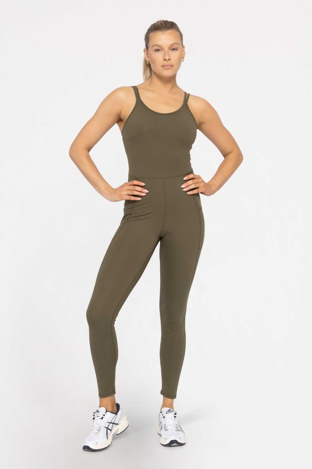 This sleeveless catsuit features a high front neckline and low back for breathability. It has double adjustable straps for extra support, a full built in bra, inseam legging pockets, and smooth flatlock seaming. Wear it to your next workout or throw a jacket over for when you go out.
