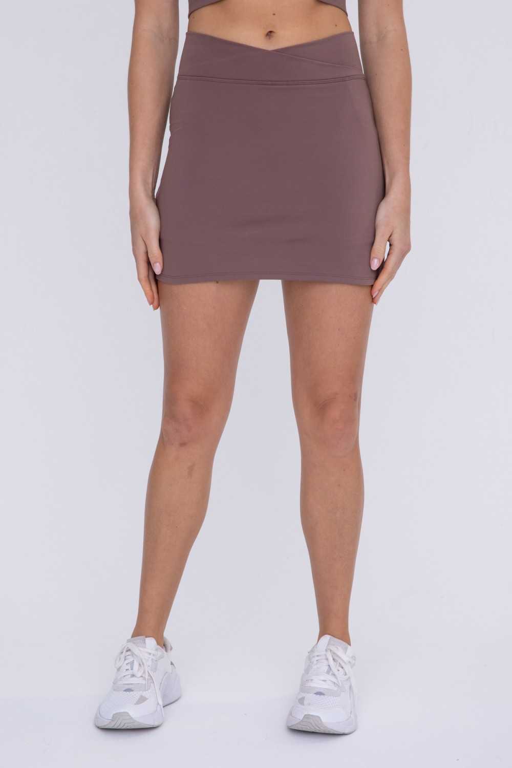 Made in our super soft, poly/spandex blend Venice fabric for added comfort, this fitted active skort is your new favorite gym piece! It features a flattering crossover waistband and built in undershorts with pockets.