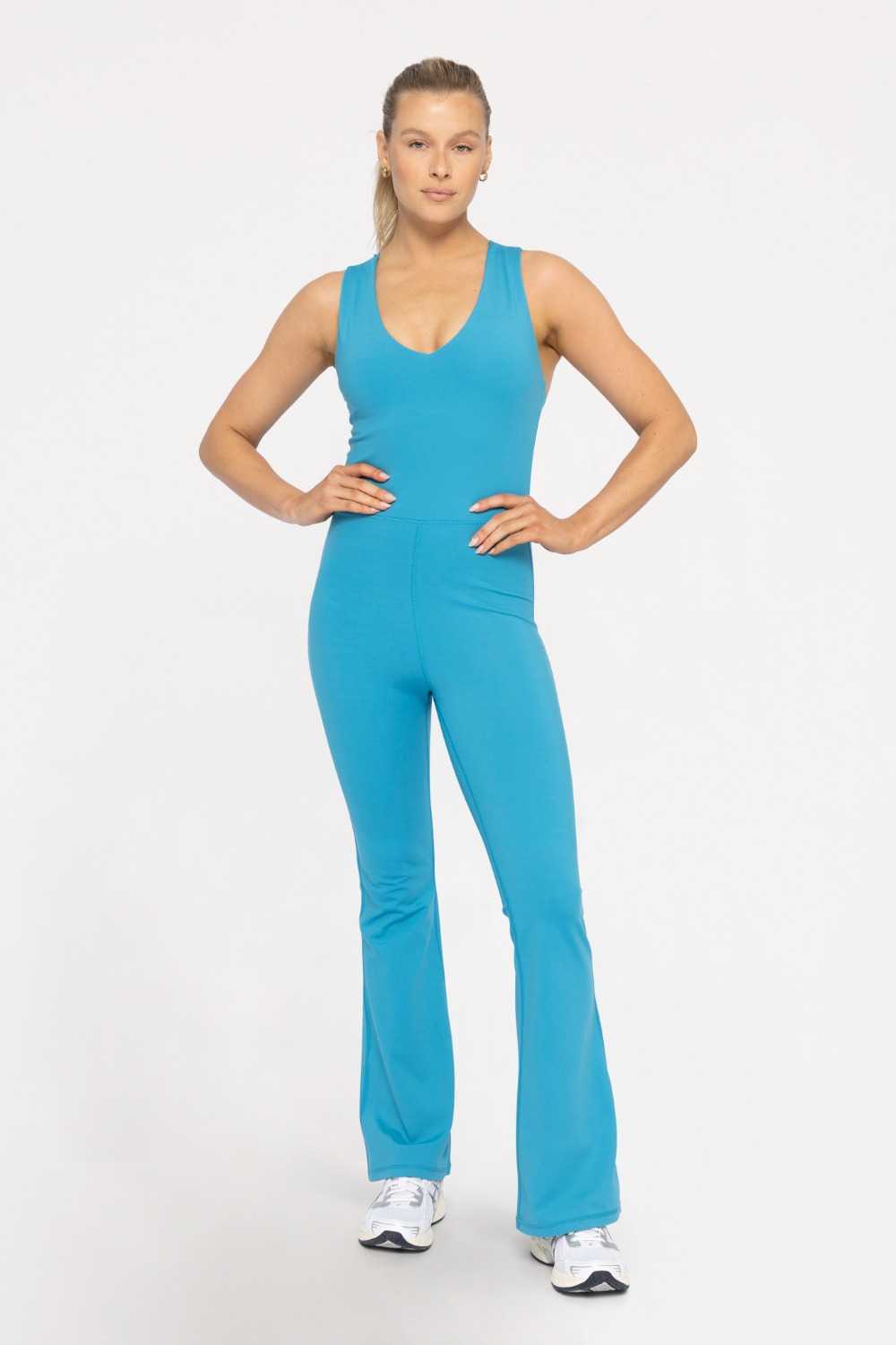 Perfect for your next workout or next lunch date, this flared jumpsuit is an easy and comfortable one and done piece. Made from a recycled poly blend jersey with a lightly brushed outer and 4-way stretch, it features a full built in bra with removable pads lined with a power mesh and a strappy cross knot detail on the back.