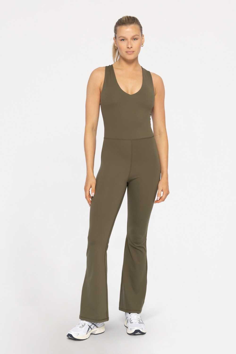 Perfect for your next workout or next lunch date, this flared jumpsuit is an easy and comfortable one and done piece. Made from a recycled poly blend jersey with a lightly brushed outer and 4-way stretch, it features a full built in bra with removable pads lined with a power mesh and a strappy cross knot detail on the back.