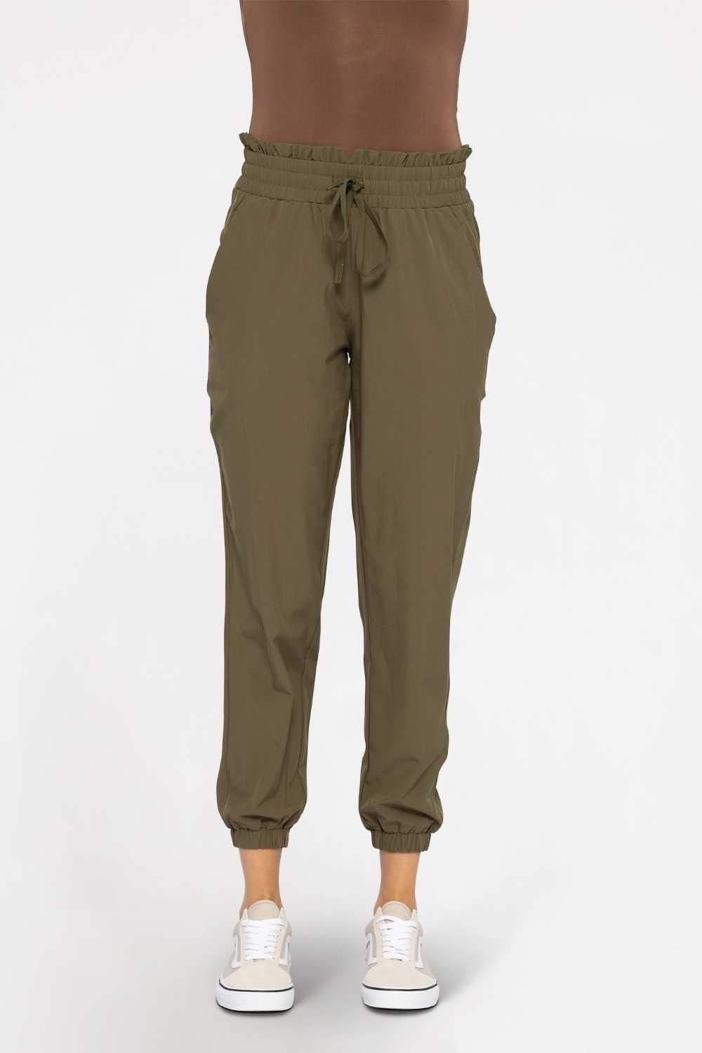 These solid-colored joggers are ready for your next adventure. They feature a high, elasticized waistband (with drawstring closure), slanted pockets, and a 7/8 length with cuffed ankles.