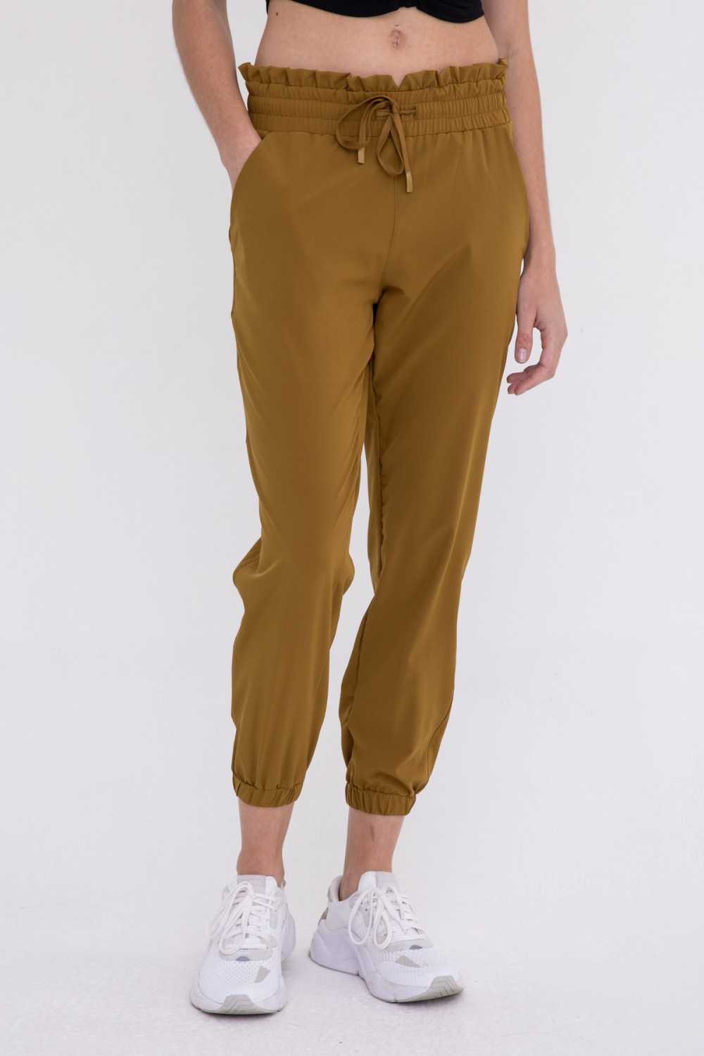 These solid-colored joggers are ready for your next adventure. They feature a high, elasticized waistband (with drawstring closure), slanted pockets, and a 7/8 length with cuffed ankles.
