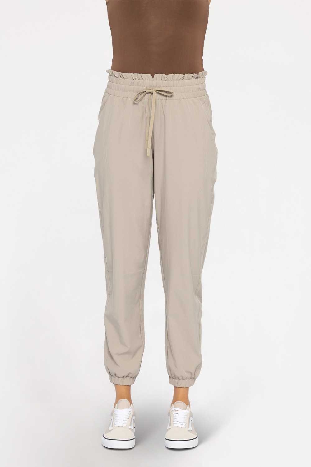 These solid-colored joggers are ready for your next adventure. They feature a high, elasticized waistband (with drawstring closure), slanted pockets, and a 7/8 length with cuffed ankles.