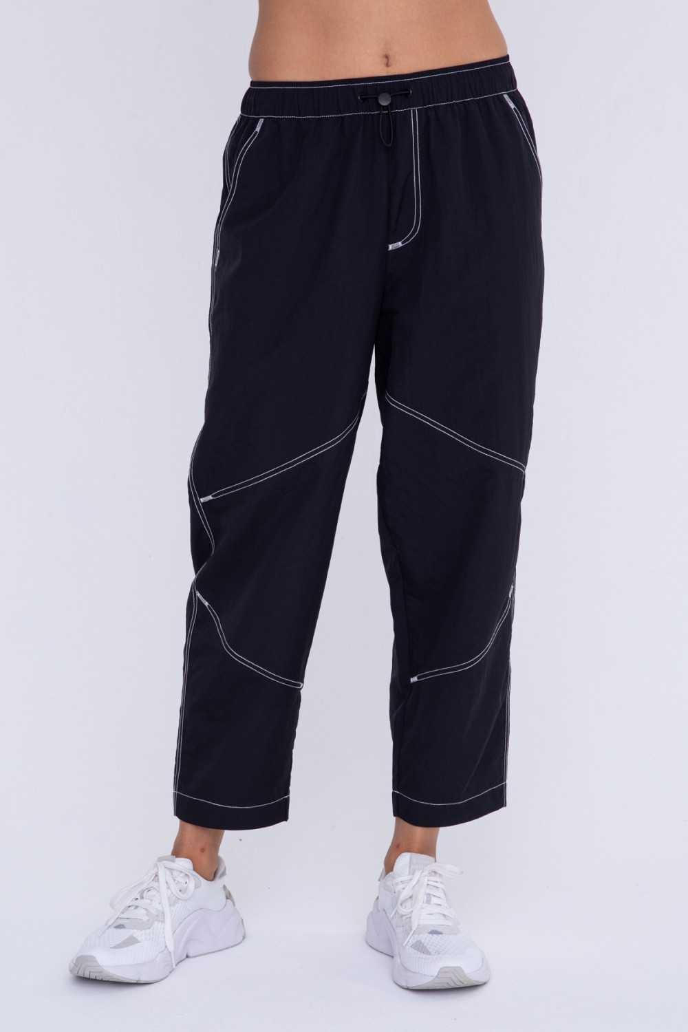 Lightweight and laidback, these nylon pants come in an oversized boyfriend fit. They feature an elastic waistband with an adjustable bungee, a faux fly stitching, a contrast topstitching for street style energy, slash hand pockets, and knee panels for mobility. Pair them with a crop top or oversized tee.