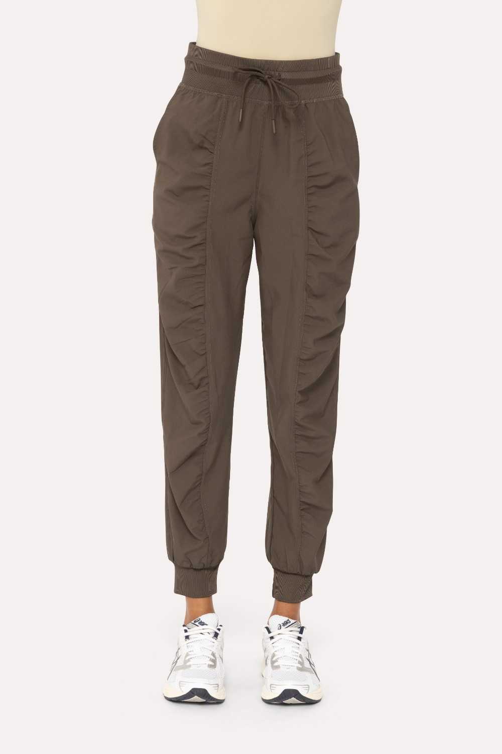 These lightweight woven jogger pants will keep you trek-ready. They feature a ribbed cuff at the hem and waistband, an adjustable drawcord waistband, a ruched detail on body front, side pockets, and a ribbed rear yoke for additional movement and comfort.