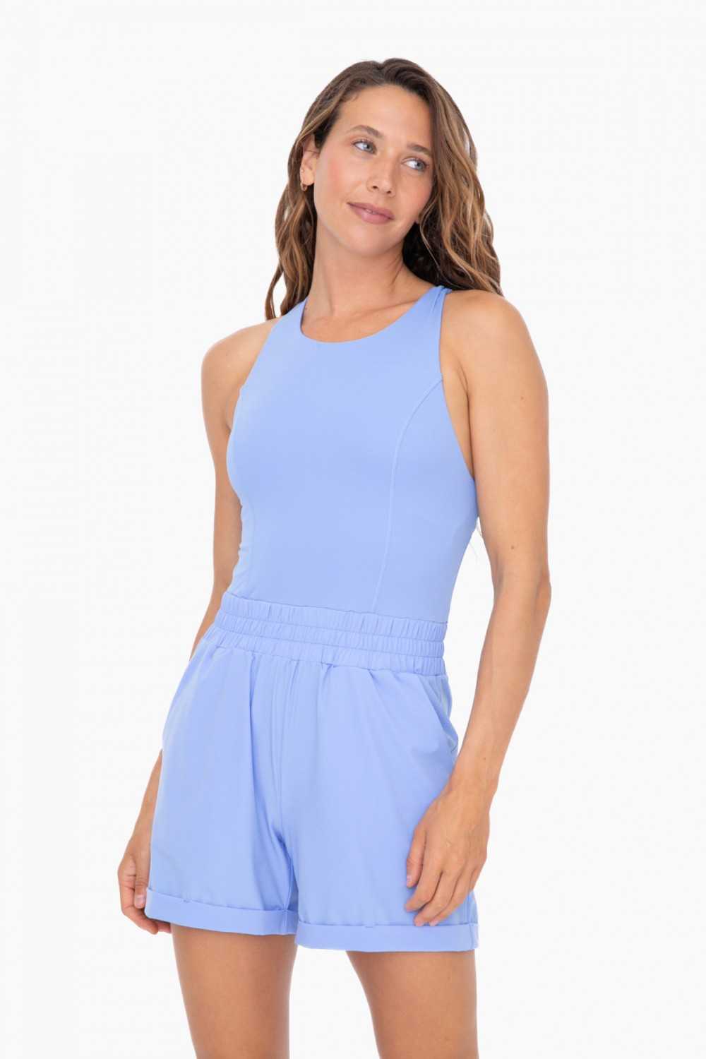 The best solution to that active top riding up or shorts falling down during your workout? Our one and done running shortsie! Our latest active one piece is constructed from a jersey tank with contouring princess seams and thicker straps for support and a stretch woven shorts with slash pockets. It features an elastic waistband and built in bra support with removable pads.