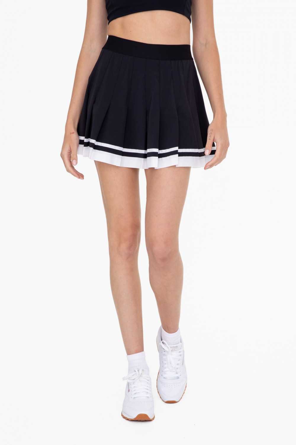 Crafted with perfect pleats, this tennis skirt features a contrast stripe trim in a high end grosgrain ribbon and built in undershorts with pockets for coverage and convivence.