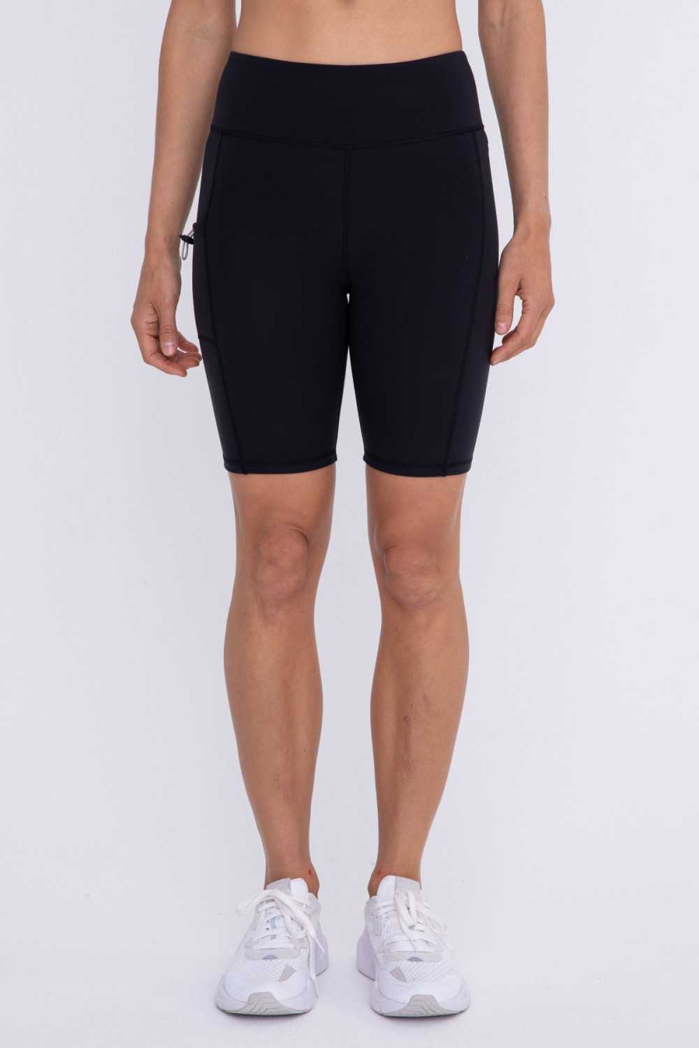 Crafted using a recycled polyester blend jersey, these these high-waisted hiking shorts feature a lightly peached and soft outer, smooth flatlock seaming, side seam pocket on the wearers right, a bungee at the pocket opening to hold in a water bottle or other items, and an invisible zipper pocket at the back waistband.