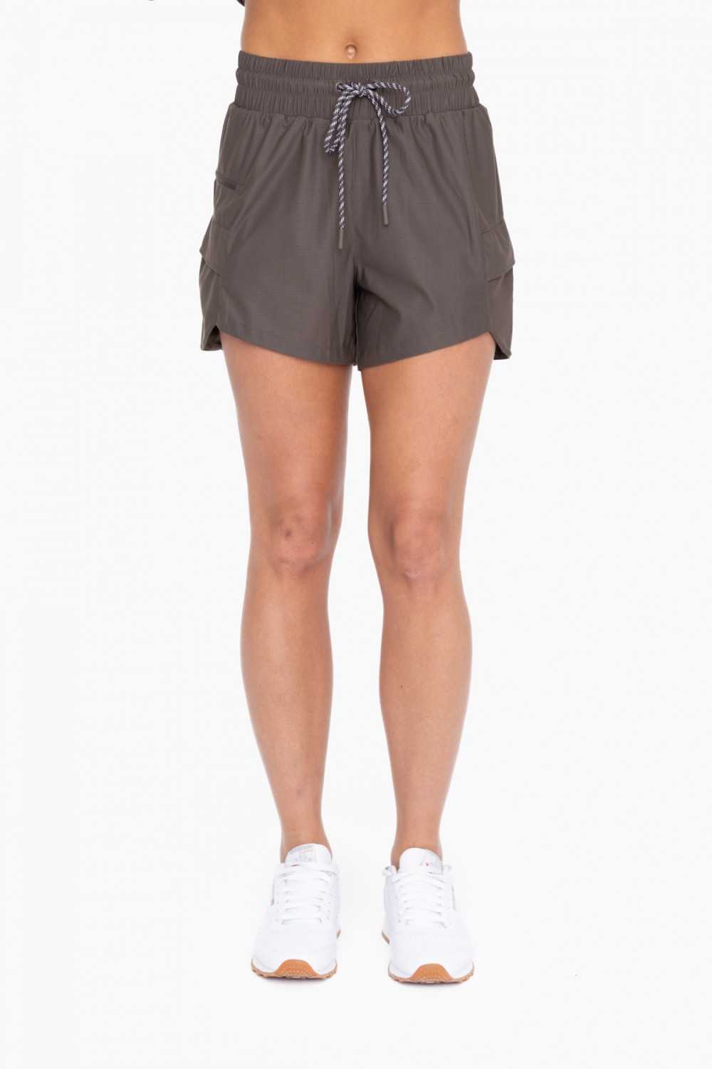 Fashionable and functional, these durable cargo style active shorts are made from a 4-way stretch ripstop fabric to withstand the toughest of terrains. They feature cargo flap pockets, zippered side pocket, a variegated drawcord, an elastic waistband, and a built in panty liner.