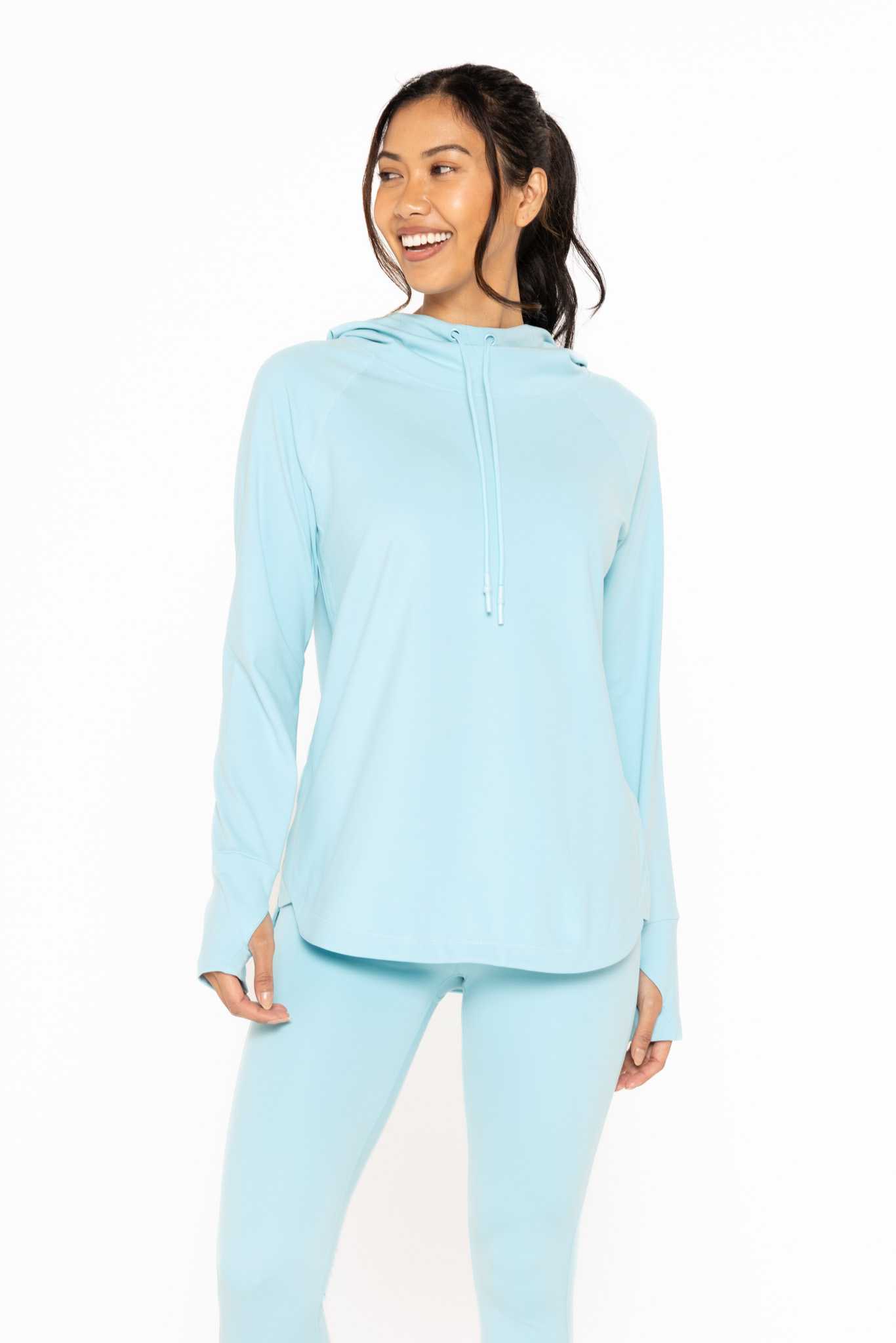 Constructed from recycled polyester (woven with spandex for four-way stretchiness), this hoodie top cuts a relaxed silhouette with a high neckline, a drawstring feeding through grommets, long sleeves with thumbholes, and a curved hemline for a flowy look.