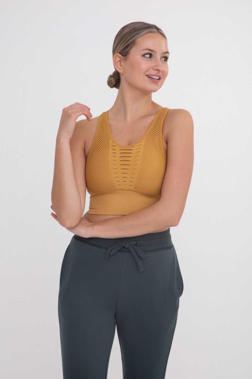 This unique sports bra is such a statement piece! It blends lattice-style mesh with laser-cut design on the front as back for a bold look.