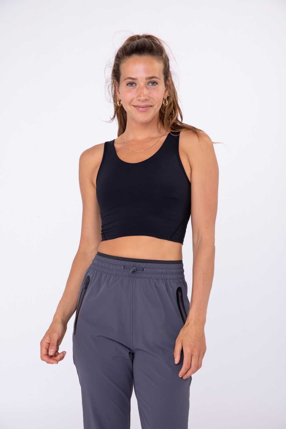 This sports bra features an elongated body for more coverage on the mid-section, as well as slanted side seamlines for a streamlined silhouette.