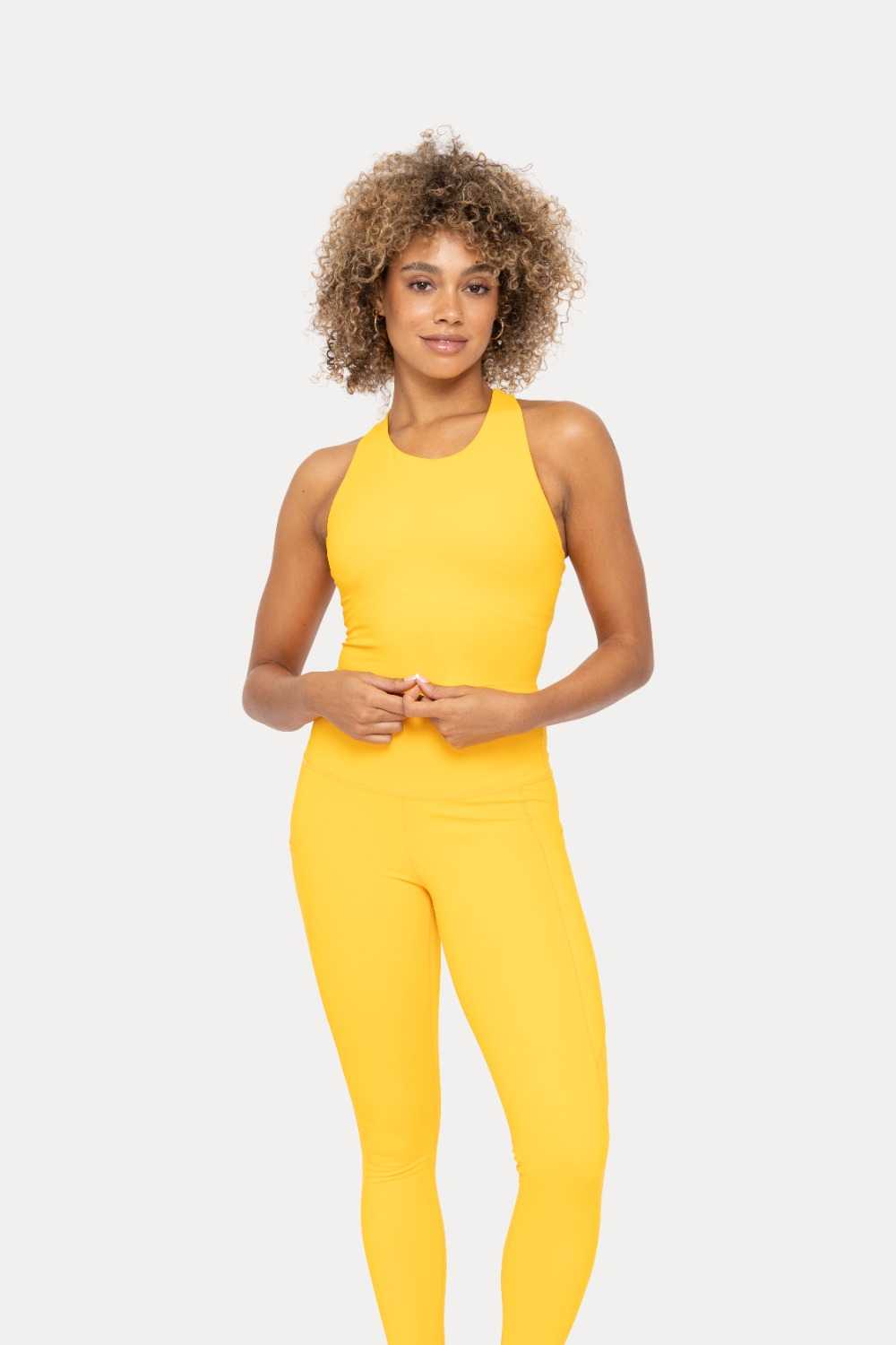 This form-fitting cropped top features criss-cross straps on the back and a built-in sports bra with removable bra pads. Pair it with your favorite Mono B print or solid-colored leggings.
