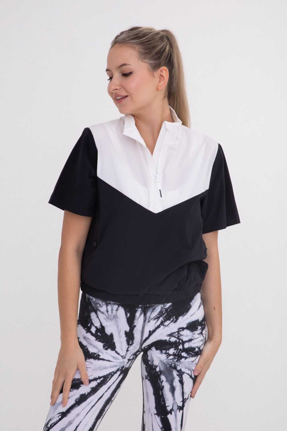 The perfect winter layering piece, this short sleeve windbreaker features a half zip that goes into a mock neck collar for extra climate protection and snap button pockets to keep your essentials secure. It has a color block styling and an elastic waistband for an adjustable fit.