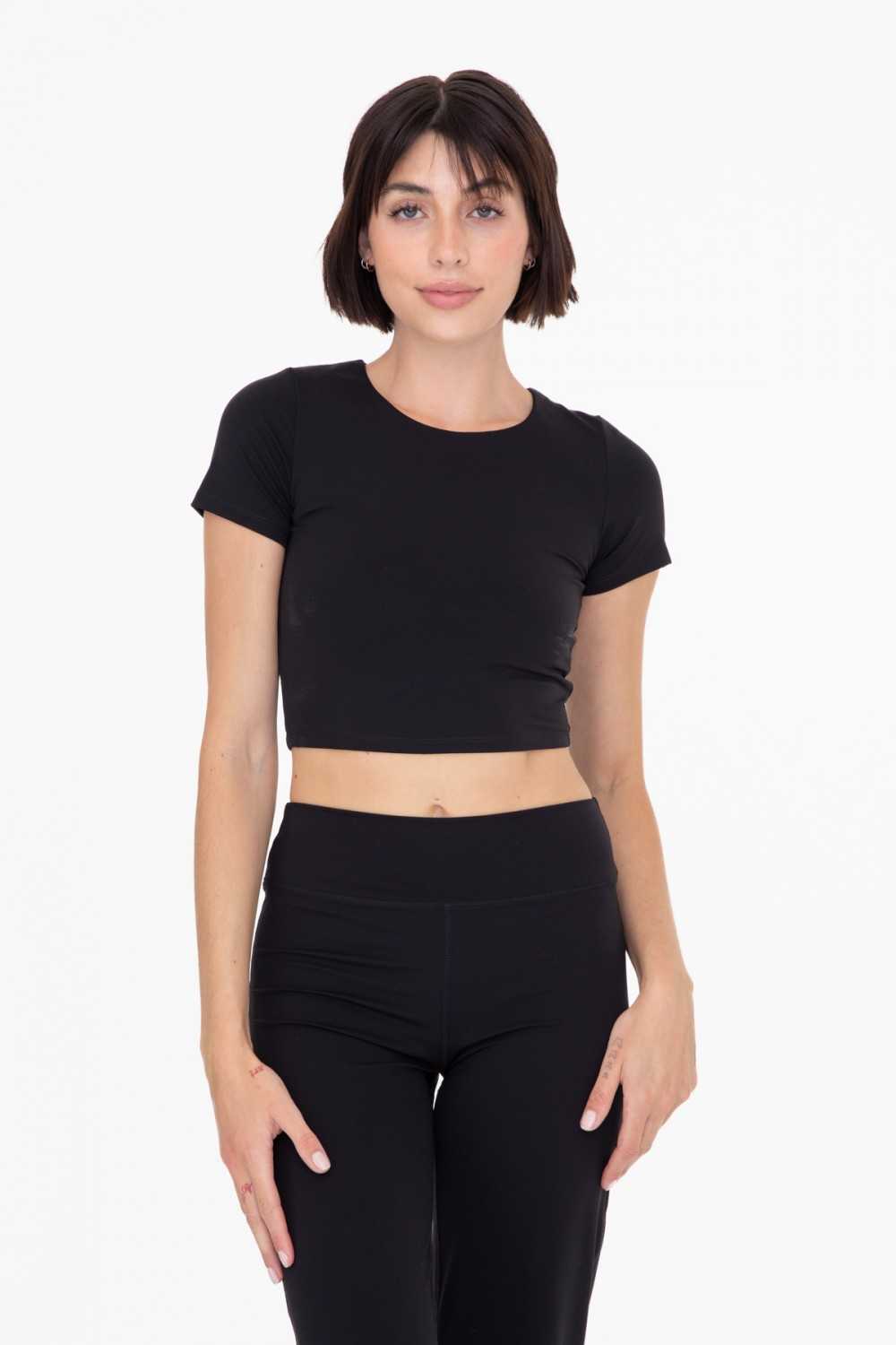 Fitted in all the right places, this cropped short sleeve tee comes equipped with built in bra support with removable pads and is fully lined with a power mesh. The graphene yarns its constructed with have UV protective and antibacterial properties.