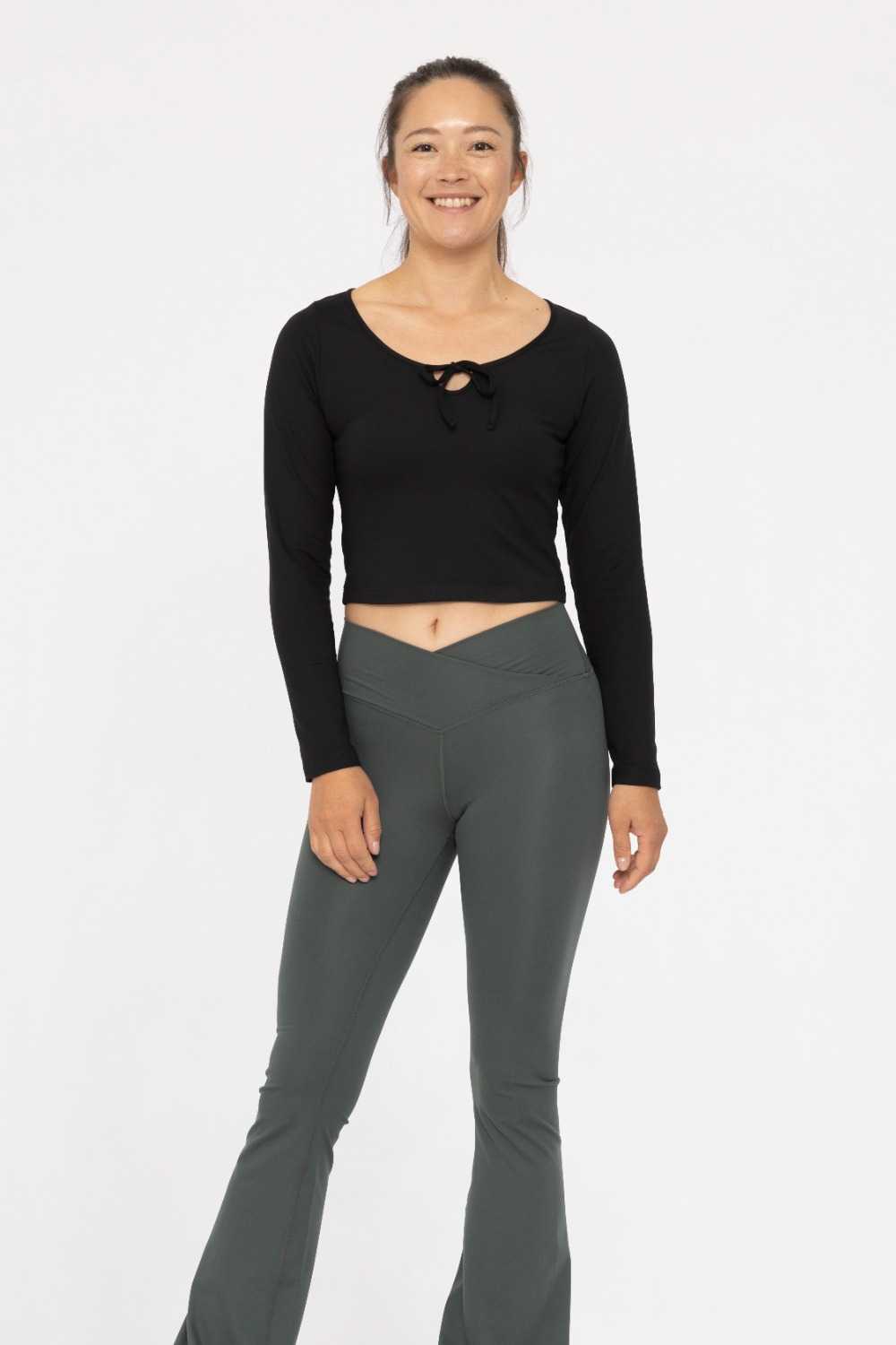 Add a touch of charm to your activewear. This fitted top features a flattering scoop neck and an elegant mini bow detail at the center front for a feminine touch. Designed with a slight crop length, it pairs perfectly with high-waisted leggings or shorts, offering a sleek silhouette that moves with you.