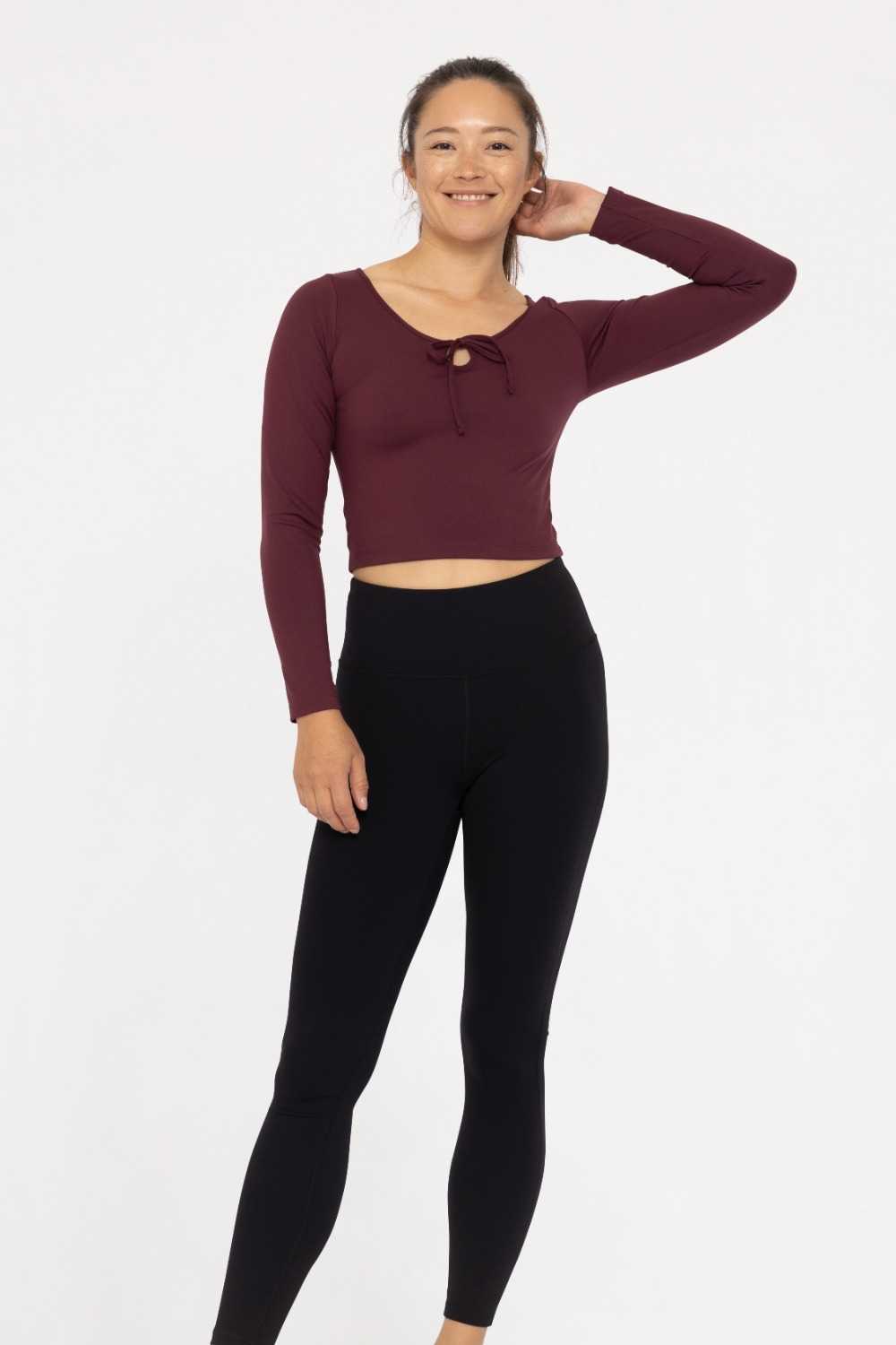 Add a touch of charm to your activewear. This fitted top features a flattering scoop neck and an elegant mini bow detail at the center front for a feminine touch. Designed with a slight crop length, it pairs perfectly with high-waisted leggings or shorts, offering a sleek silhouette that moves with you.