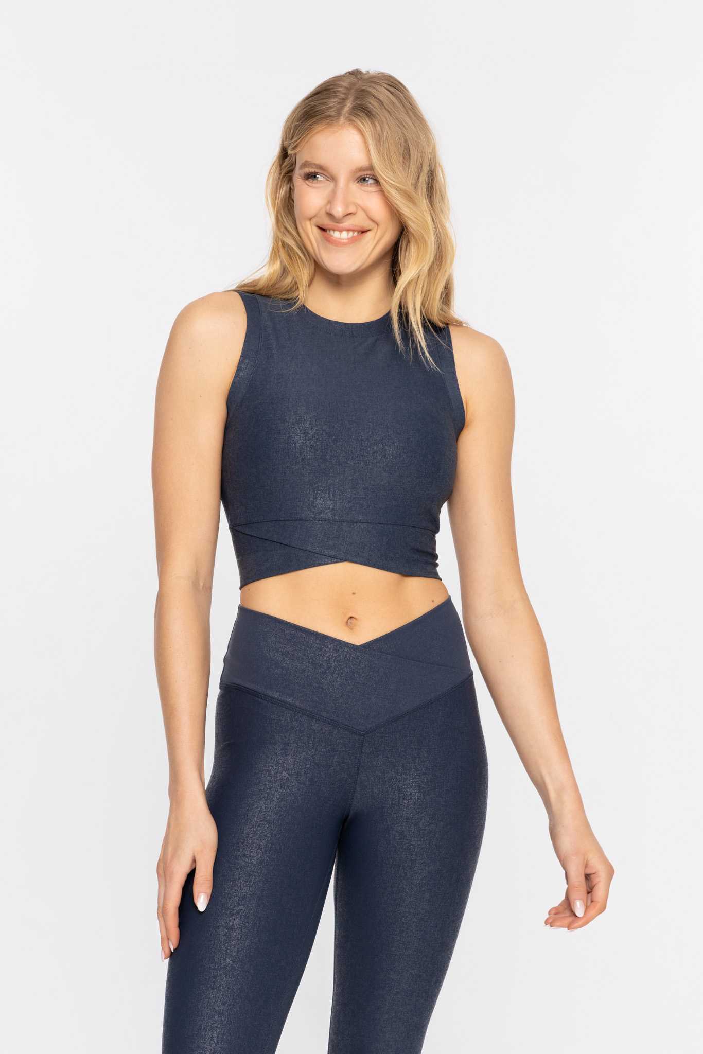 Whether you're at the gym or out with friends, this cropped high neck active top will be your go to pick! Made from the Mono B favorite foil print fabric, it features a built in bra and crossover under bust band to snatch you in at the waist!