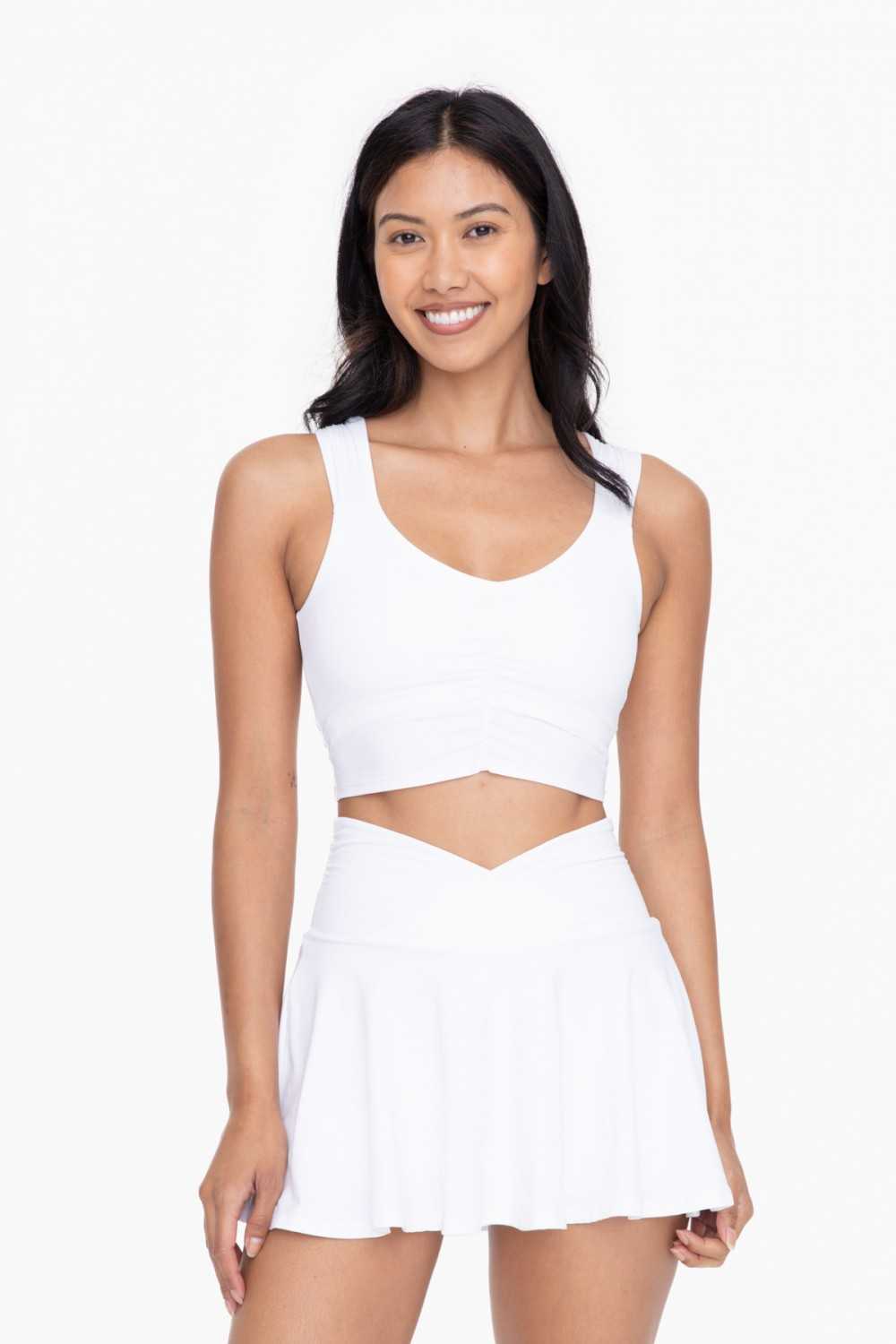 Stylish enough to wear after the gym, this active top features a built in bra with removable pads. The center front and shoulder ruching accentuate your figure in all the right places, while the wide straps provide extra supprort.
