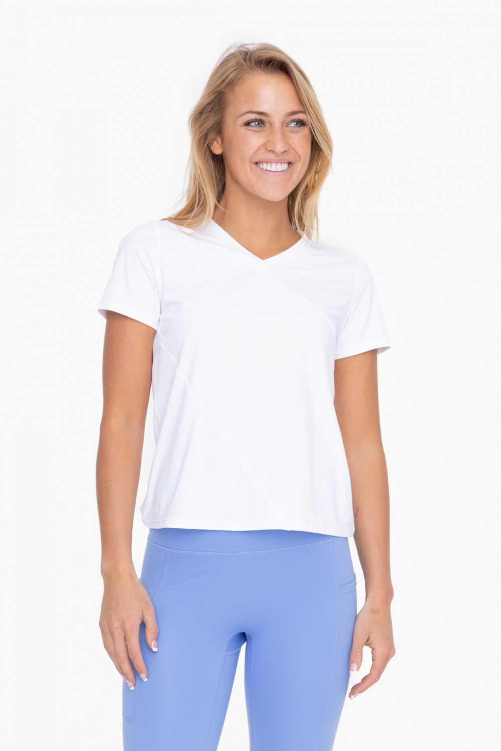 Perfect for a pickleball game or a casual shirt to throw on for errands, this classic v-neck sports tee is made from recycled nylon yarns that have anti-UV & anti-microbial properties. It features a diagonal opaque mesh paneling across body front for added breathability.