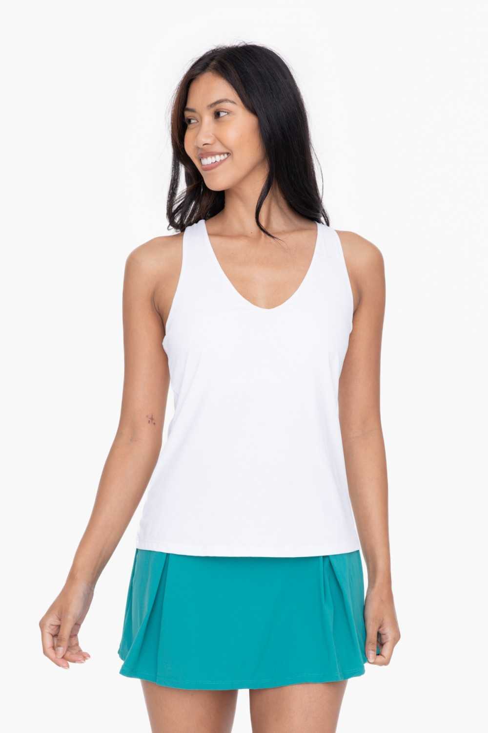 Perfect for pickleball or any other physical activity, this active tank top will make you look and feel good! It features a full built in bra support, thicker straps for extra support & hold, a low v-neckline, straps that cross in the back, side seam mesh panels for additional ventilation, and is made from recycled nylon yarns that have anti-UV & anti-microbial properties.