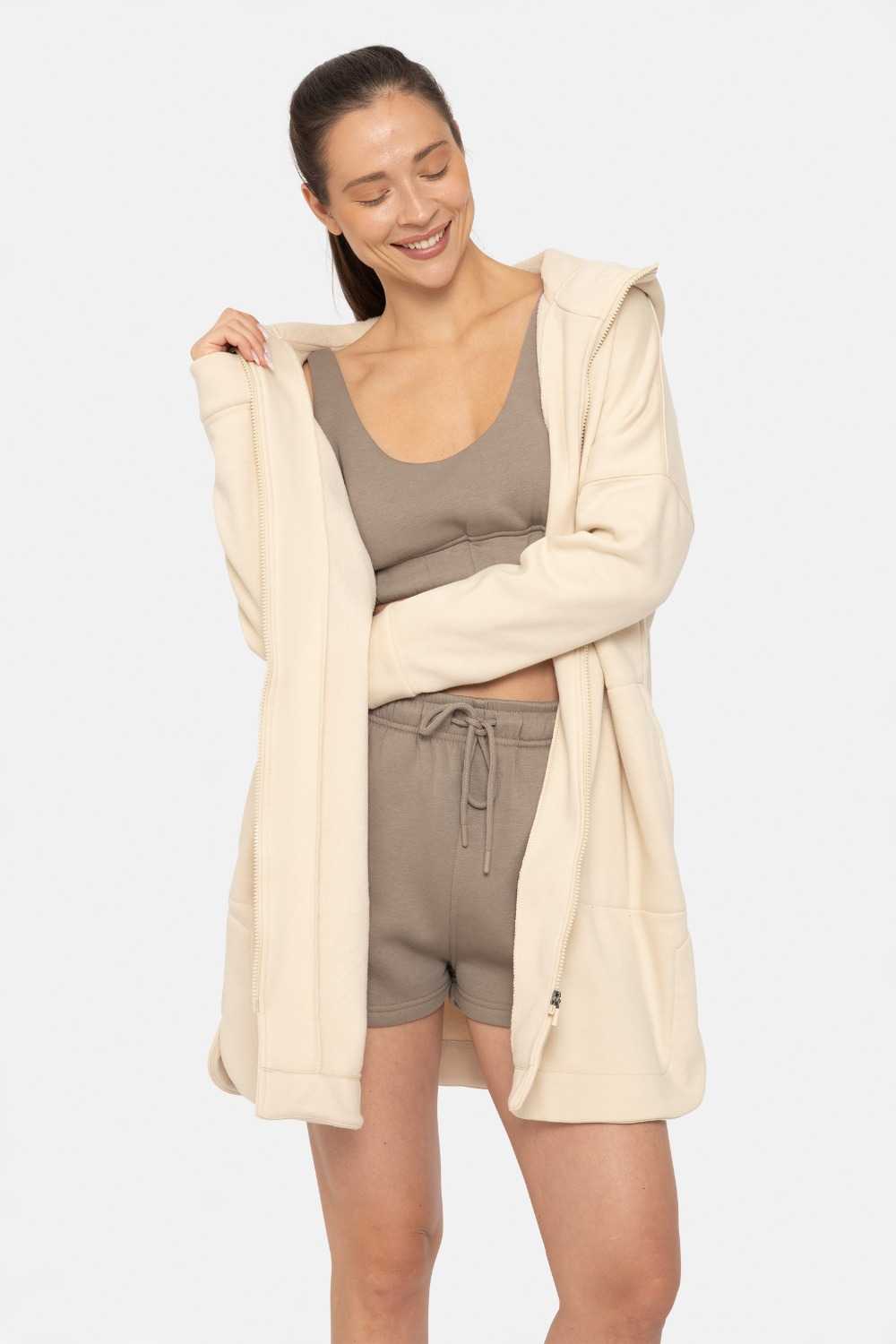 Cozy up in this longline zip up hoodie jacket. It falls to about mid-thigh length, has a soft interior, a curved hemline with notched sides, and side pockets with curvilinear stitching.