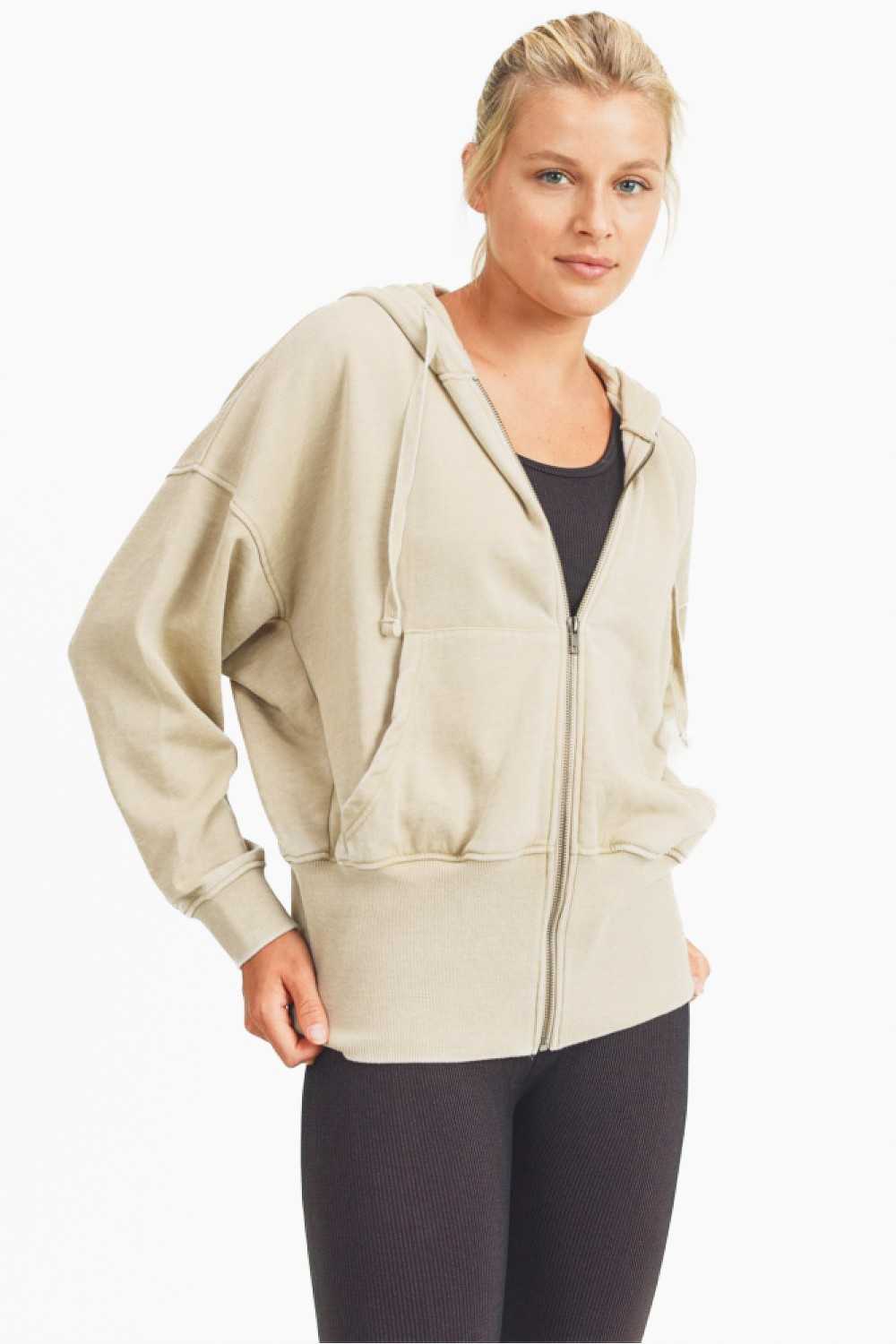 With its dropped, tapered long sleeves and wide hem cuff, this zippered jacket exudes a casual, relaxed look. It features a hoodie with drawstring closure and kangaroo pockets.