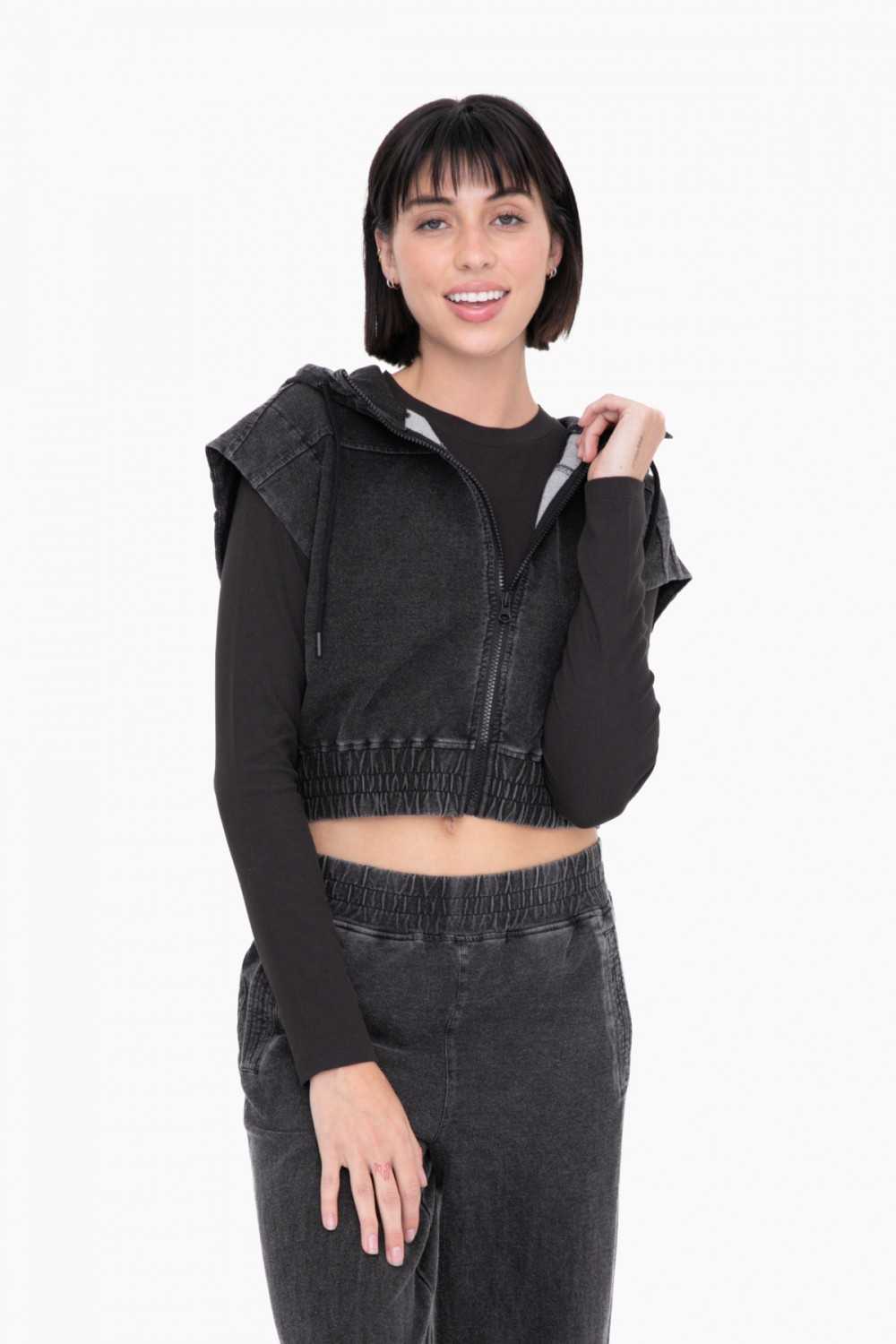 Perfect for layering, our mineral washed French Terry sleeveless hoodie will be your springtime staple. It features an adjustable drawcord at the hood and a full front zipper.