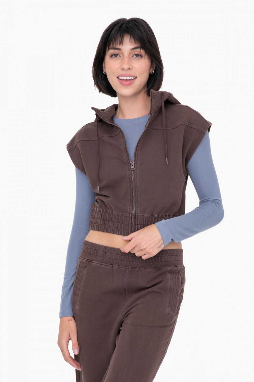 Perfect for layering, our mineral washed French Terry sleeveless hoodie will be your springtime staple. It features an adjustable drawcord at the hood and a full front zipper.