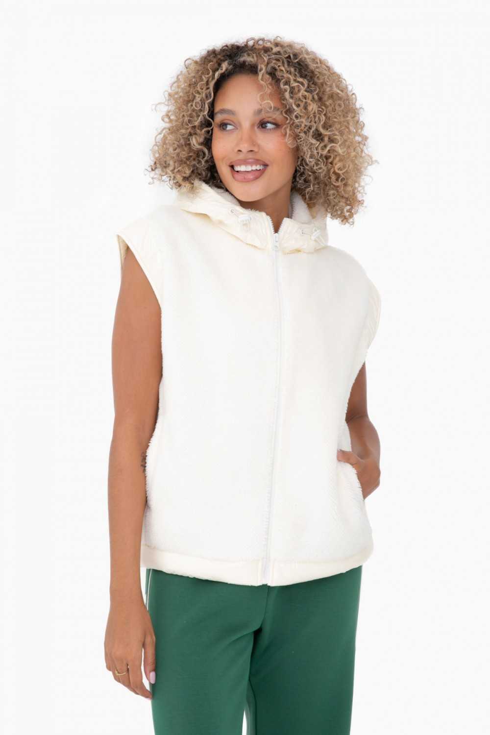 Bundle up in our ultra-plush & cozy faux fur vest! It features a contrast high shine woven trim & hood, an adjustable bungee at the neckline, a full front zip, and capped shoulder details.