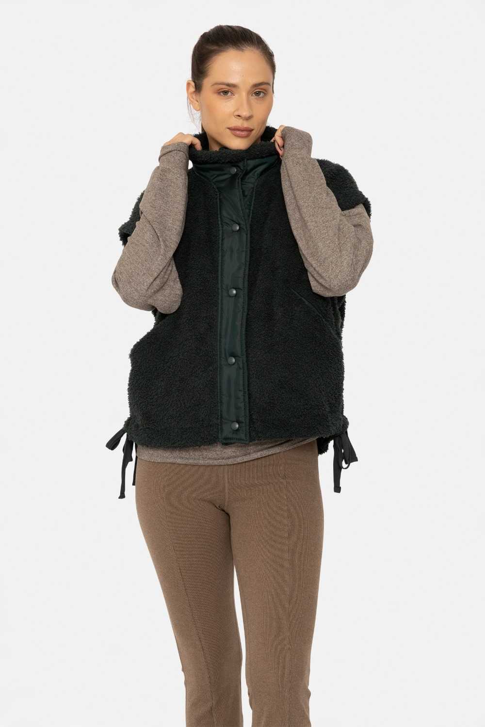 Sherpa woven vest with snap buttons, high-neck, loose fit & adjustable waist. Perfect for cozy winter layering!