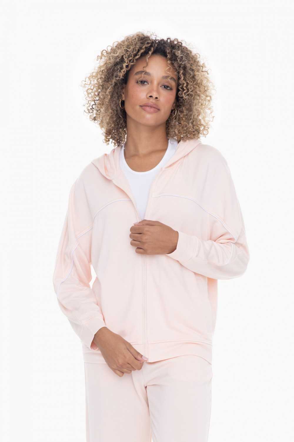 Get unparalleled coziness with our fleece lined hoodie. Crafted with an extra soft and drapey fleece, this hoodie features a retro 90s color block piping across the chest, dolman sleeves, a full front zip, and hand pockets.