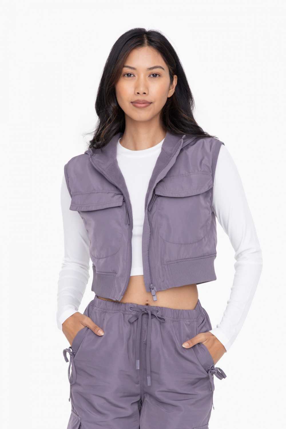 Elevate your style and stay comfortably chic no matter the weather. Our cropped cargo style vest is crafted using a water resistant fabric and features a satin finish for a luxurious feel. It is fully lined with a lightweight fleece, has patch pockets with zip closures, and is ribbed at the hem.