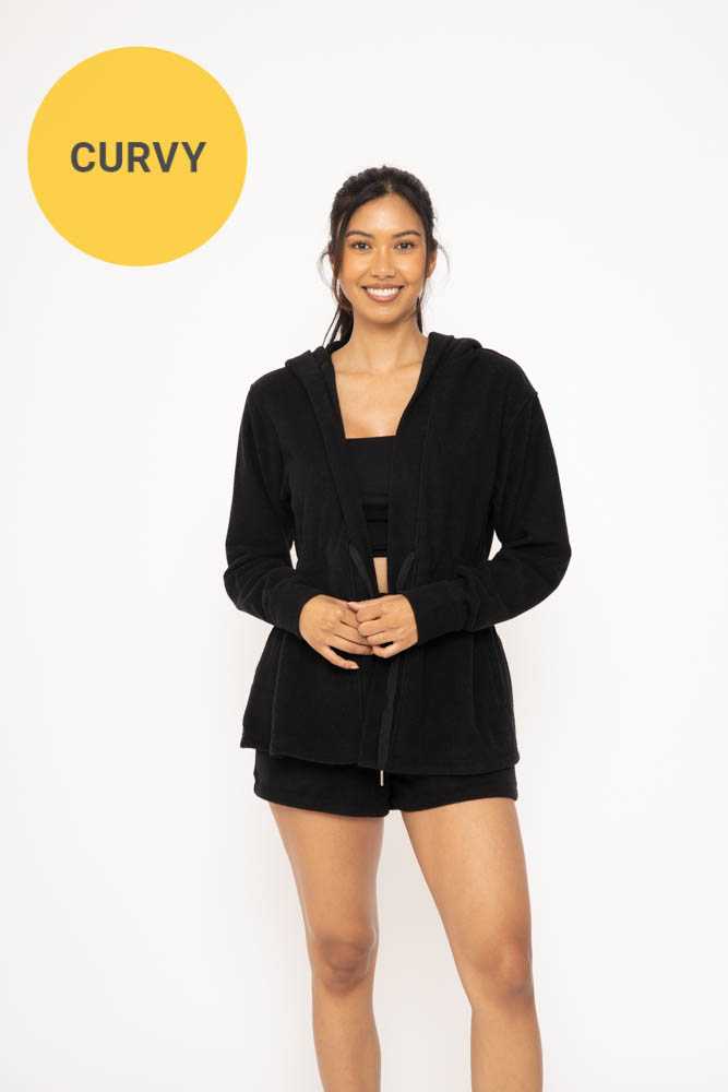 CURVY Cotton Blend Hooded Waist Tie Cardigan Black