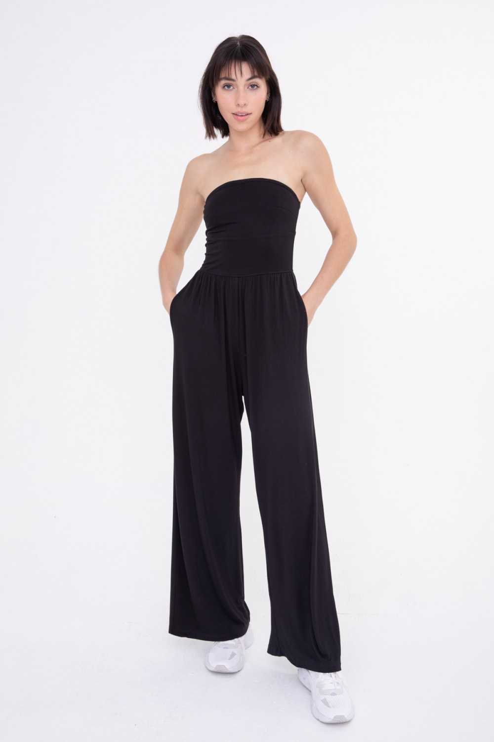An easy and effortless piece to add to your wardrobe. This strapless lounge jumpsuit features a silicone elastic to prevent slippage, a fitted bust, gathered waistband, and a flared pant for comfort and mobility.