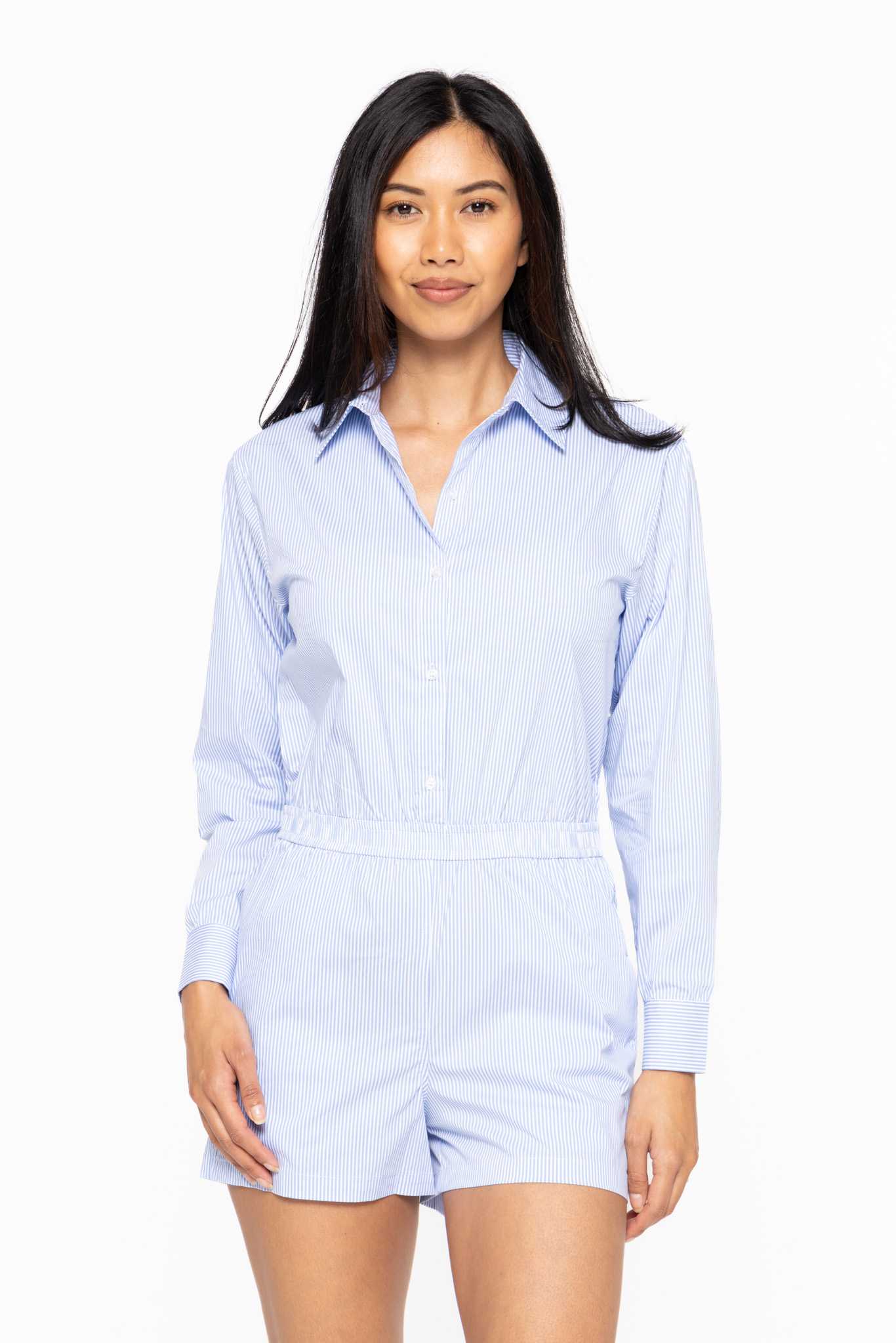 Chic and comfortable, this classic pajama inspired romper perfectly blends luxurious softness with effortless style. It features an elastic waistband, front button closure, long sleeves with classic cuffs, side inseam pockets, and a stand up collar.