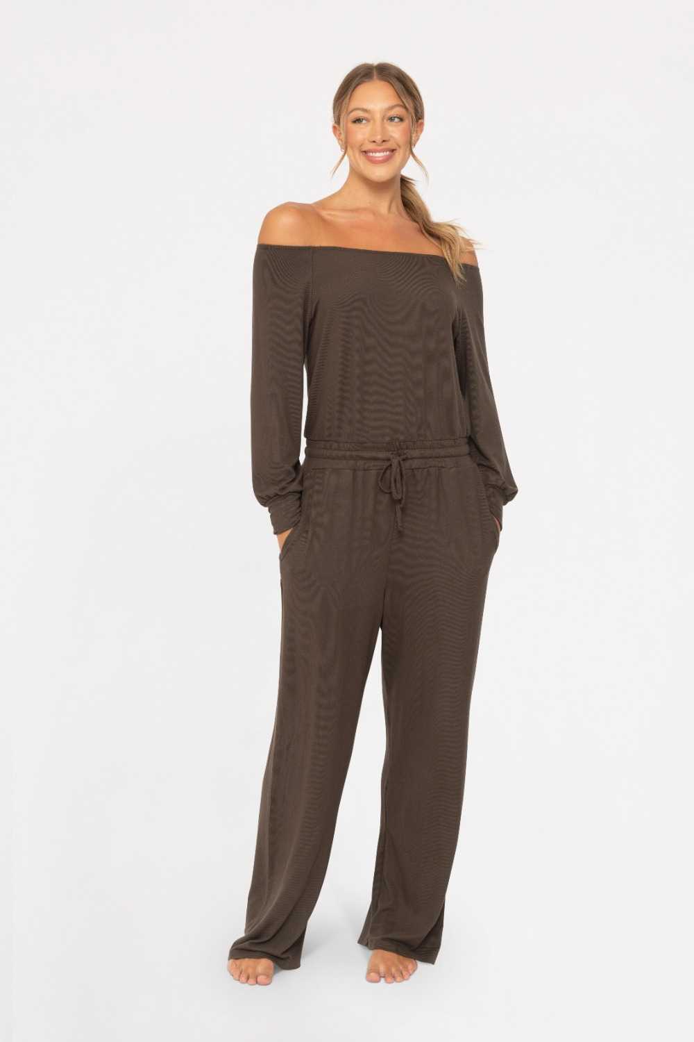 Off-the-shoulder lounge jumpsuit with long sleeves and cuffed wrists. Features an elastic encased waistband with a drawstring, wide legs, and inseam pockets for a stylish and comfortable fit.
