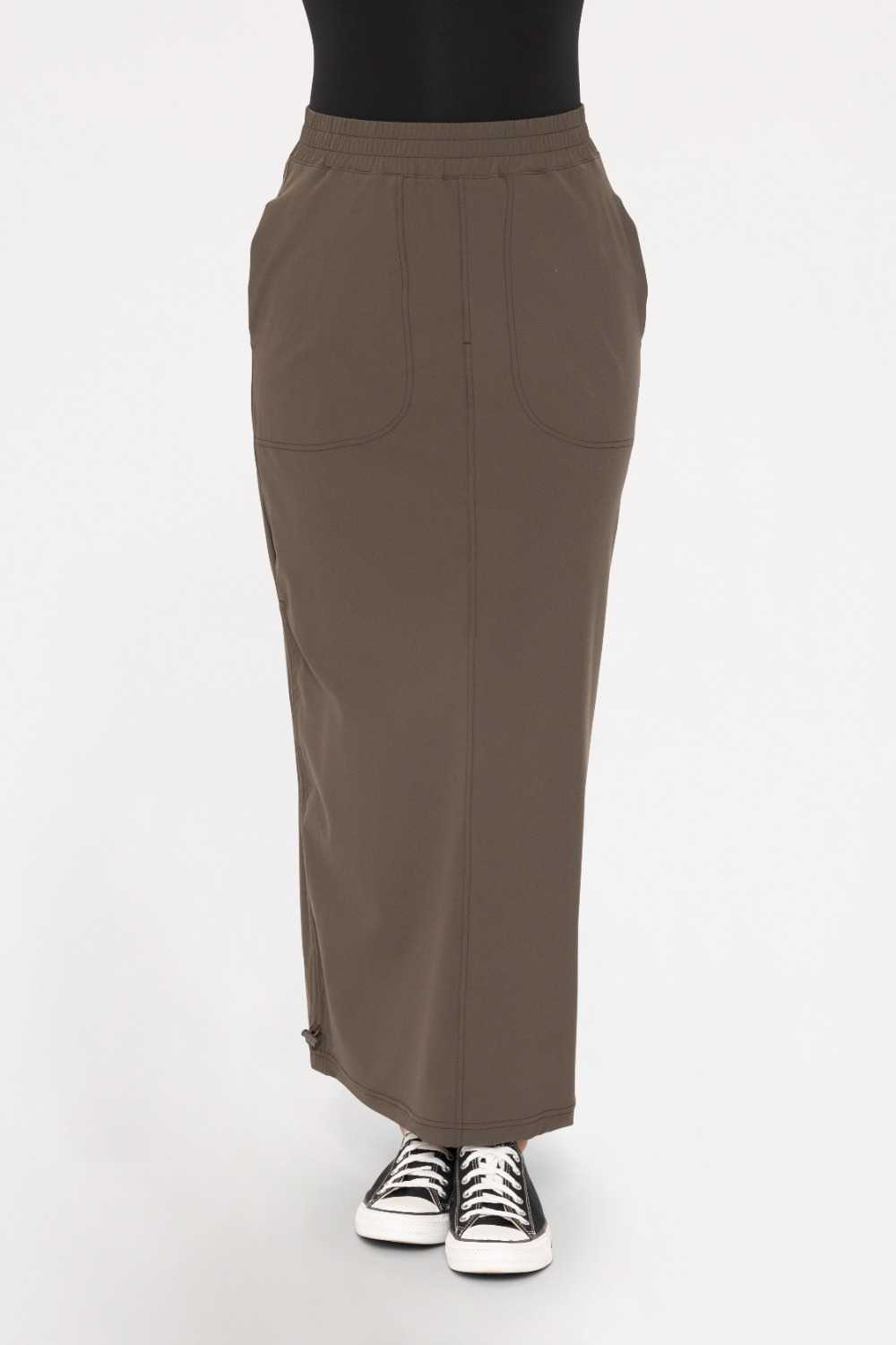 Bring back the 90's with this mid-rise cargo-style skirt. With an extra long utilitarian look, it has an elastic waist, side pockets and an adjustable bungee at side seams for the option of showing more leg.