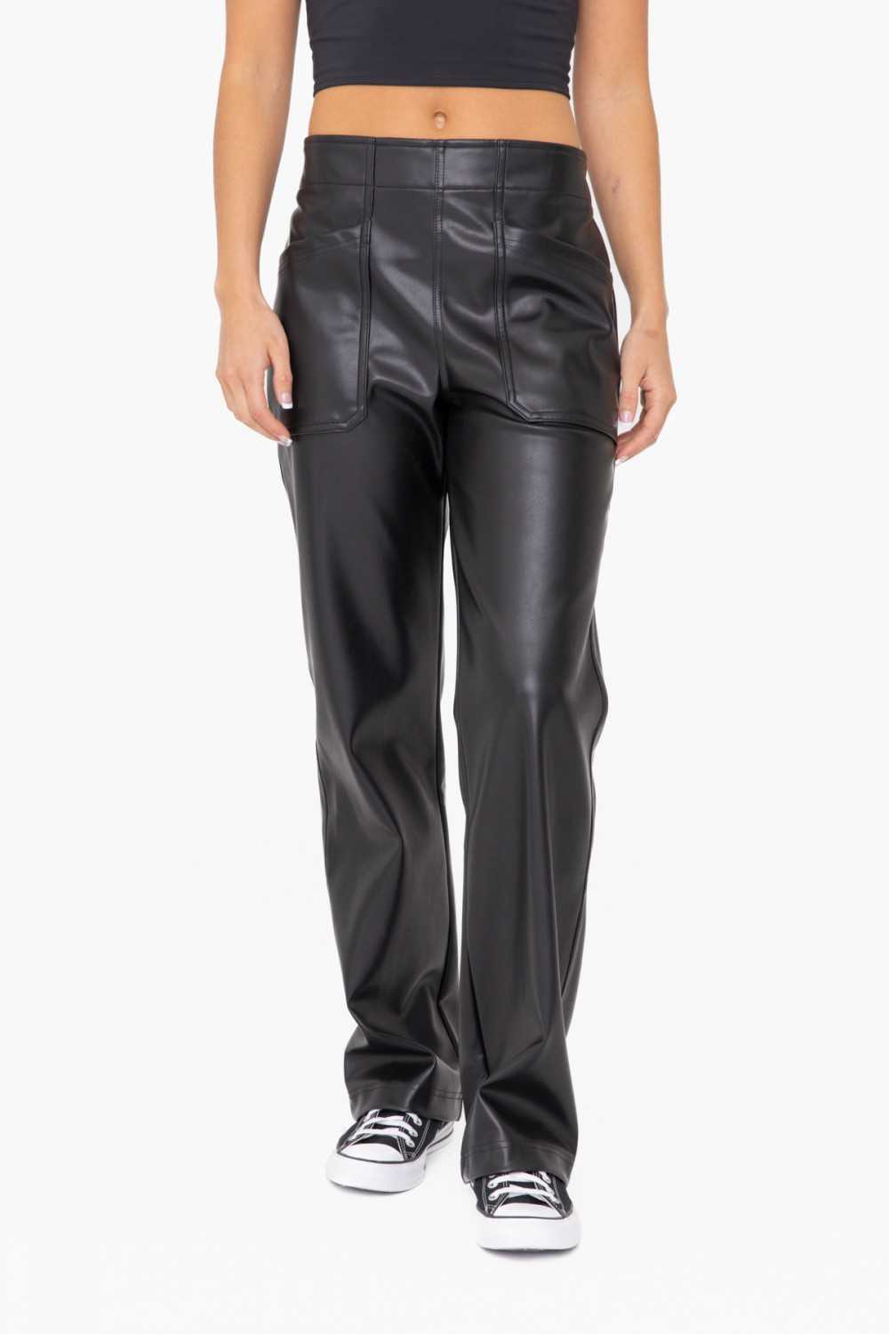 Add a cool edge to your everyday look with these vegan leather wide leg pants. Made from a supple and stretch vegan leather with a soft inside, these pants feature oversized patch pockets and an elastic waistband for a comfortable fit.