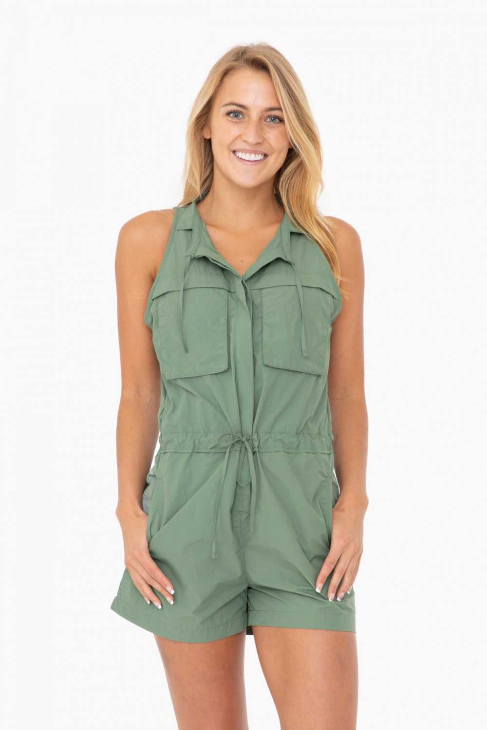 Embrace style and practicality in one piece with this romper. Made from a non-stretch woven fabric, it features utility style pockets & ties, hand pockets, and a hidden button placket.