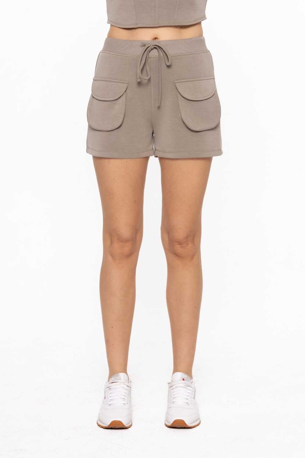 Relaxed lounge shorts with a ribbed waistband, self-tie drawcord, and front cargo pockets for a casual and comfortable vibe.