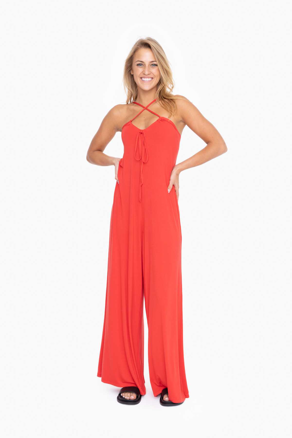 The cutest and comfiest jumpsuit you'll own! Made with a super soft and drapey rayon blend fabric, this wide leg jumpsuit features a cross strap front design with adjustable ties to get the perfect length.