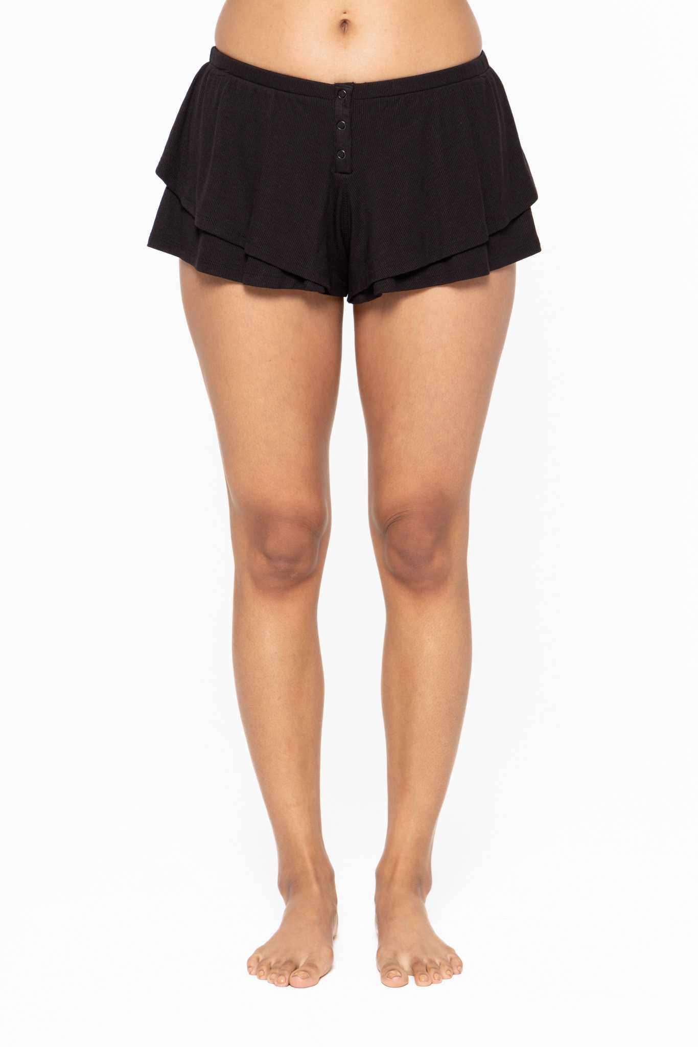 Elevate your summer style with our double ruffle/flutter shorts. Featuring a Henley front closure and elastic waistband for comfort, these shorts offer both flair and functionality. With a 2-inch inseam, they're perfect for staying cool and chic on warm days.