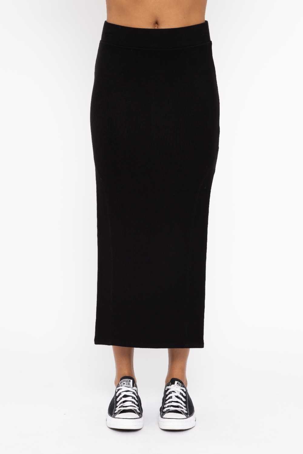 This ribbed midi skirt is a must-have for any occasion. It features a ribbed texture, a flattering high-waisted silhouette, and double side slits starting at mid-thigh for added style and movement.